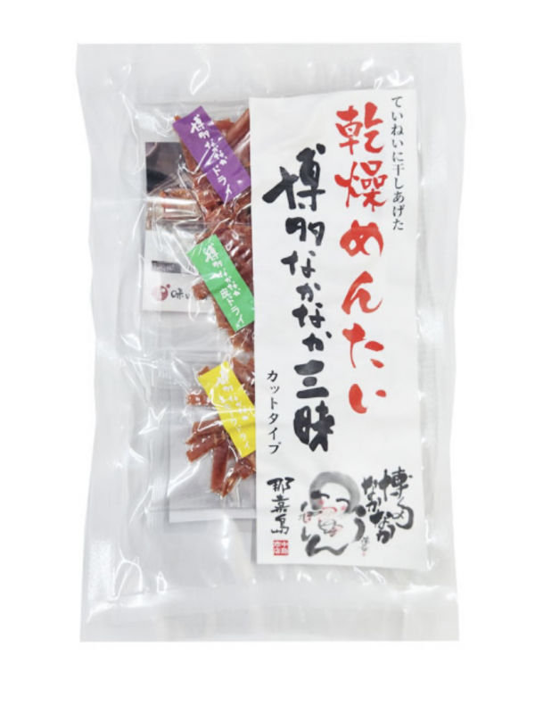 からすみ風ドライ明太子、明太子の皮ジャーキー風、ドライ明太子の燻製を食べやすくカットし、チャックシール袋で小分けしています。