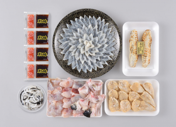 | トラフグ刺身 25㎝皿70ḡ、トラフグ本皮 40g、とらふぐちり 270g、マフグ唐揚 200g、マフグたたき 2本、鍋用ポン酢 15g×4、鍋用もみじおろし 5g×4 |